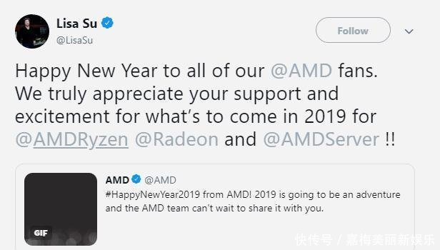 日前AMD CEO苏姿丰在推特上向A饭发表祝贺,感谢粉丝们的支持,并对2019年值得兴奋的产品表达了期待,苏博士还圈了AMD的锐龙、Radeon显卡及EPYC服务器部门。